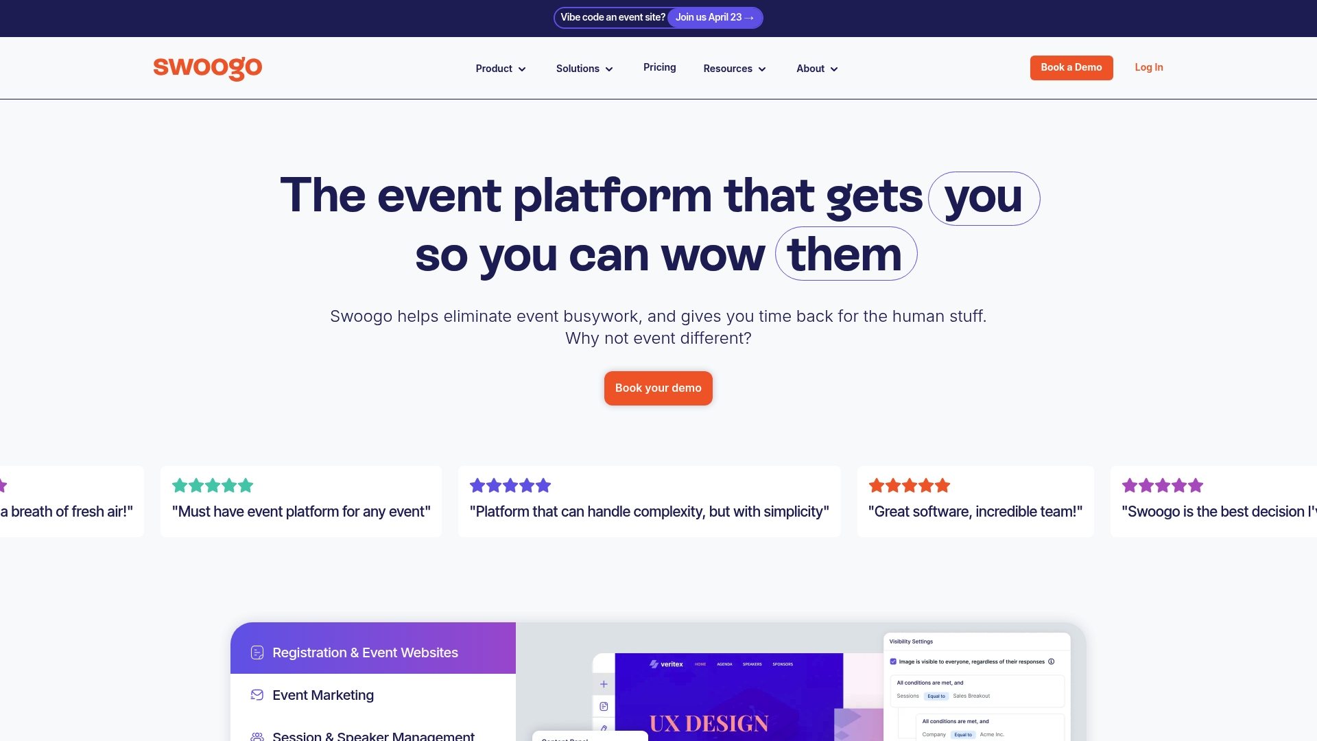 | Swoogo | Registration and logistics, virtual delivery, deep customization integrations | Comprehensive feature set, scalable for various events, in-house support | Higher cost for advanced features and steeper learning curve | Contact for pricing |